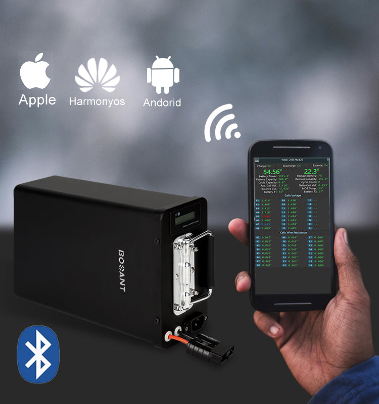 - Battery BMS : The battery comes with a 20A BMS to prevent risks such as overcharging, over-discharging and overheating, and also has a Bluetooth module, so you can check the battery status through your phone.