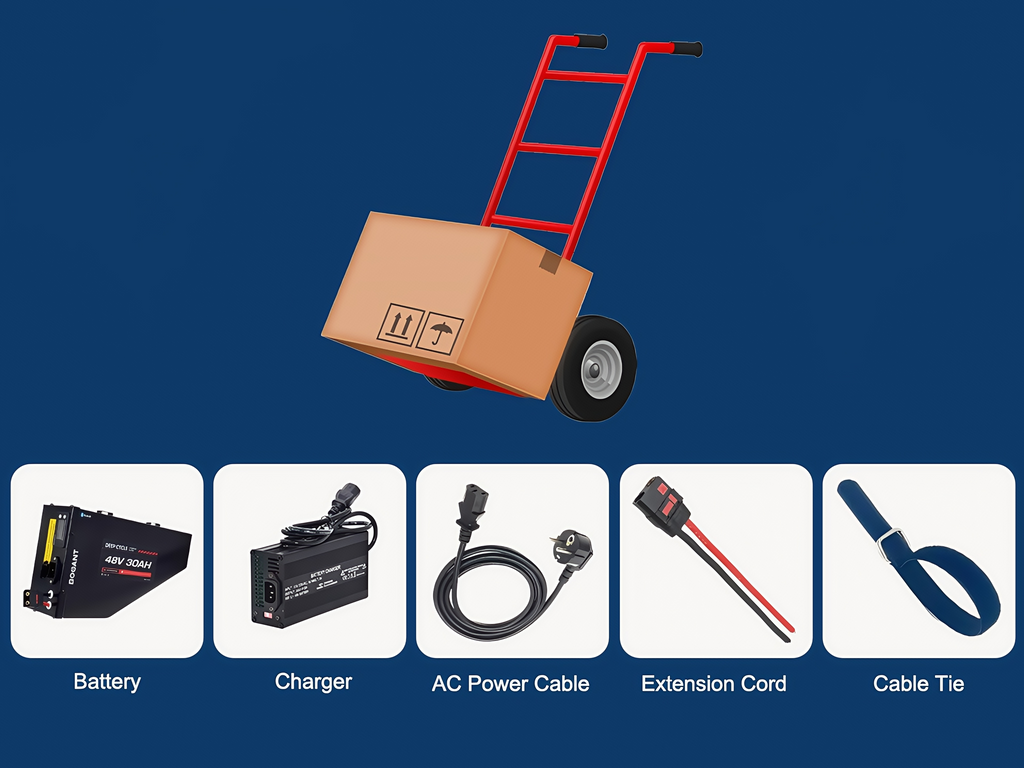 Battery with Metal Case*1 54.6V 5A fast charger*1 AC power cord*1 Discharge extension cord*1 Fixing tie*4
