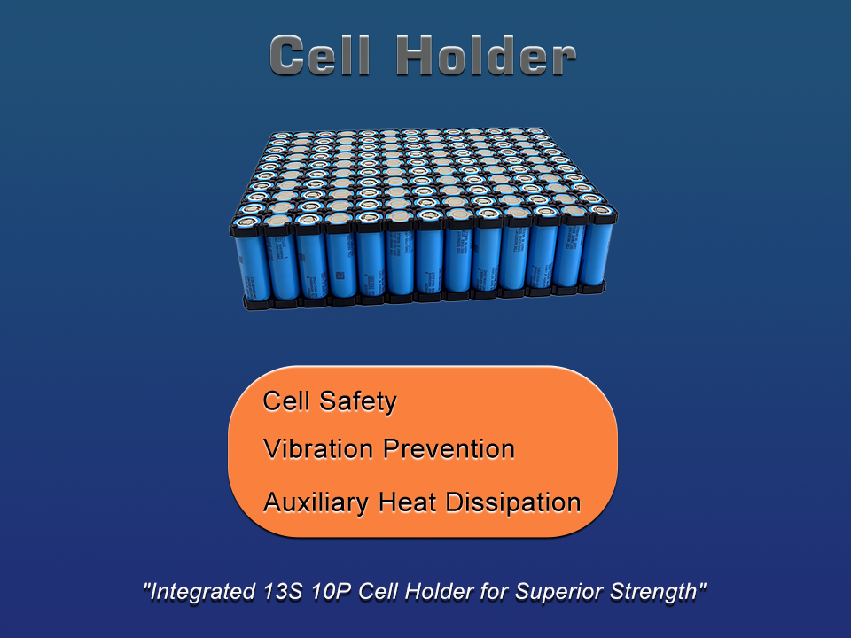 ABS cell holders ensure uniform performance across the battery pack.