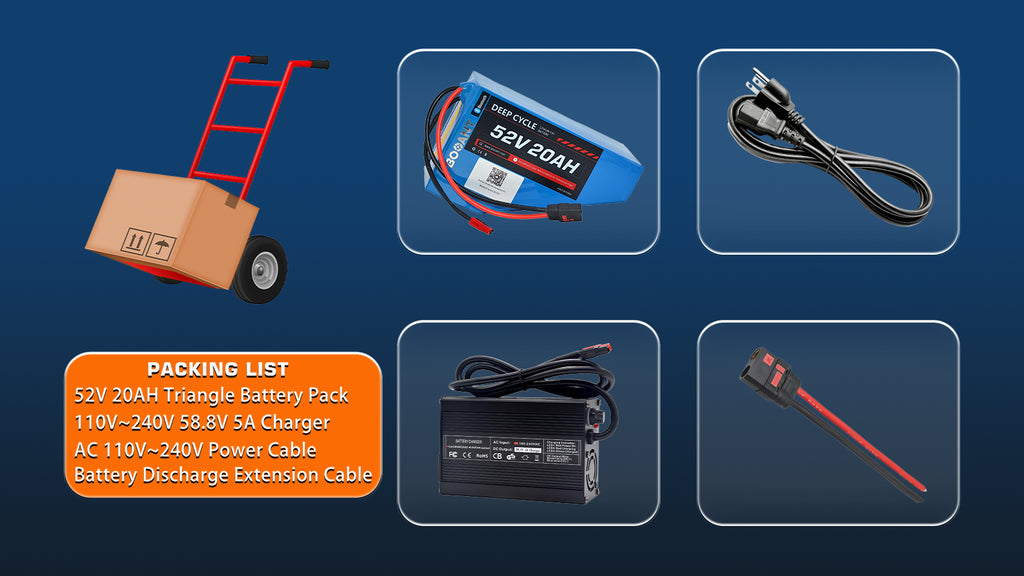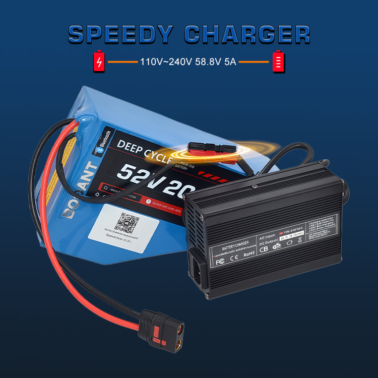 - Rapid Recharge with Included 58.8V 5A Smart Fast Charger : Get back on the road faster. We include a 5A fast charger specifically designed for this 52v 20ah battery, significantly reducing charging time compared to standard models and ensuring your li-ion battery is ready when you are.