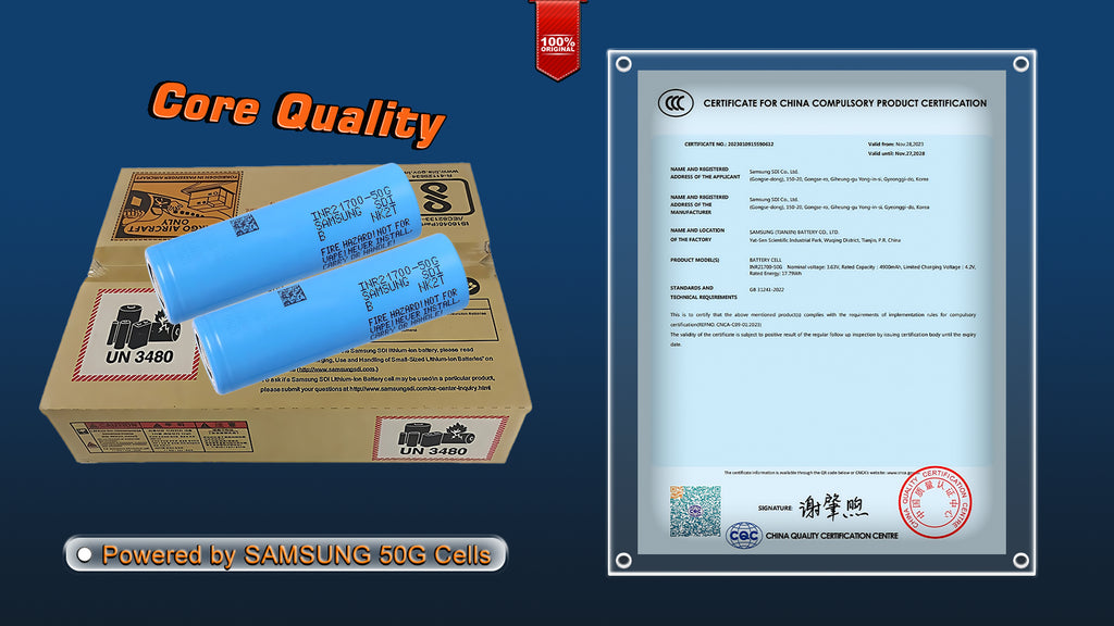 Equipped with genuine Samsung 21700-50G high-rate power cells, delivering 20AH capacity and 52V output. Offers robust power and extended range, supporting frequent charge/discharge cycles with extended lifespan and reliability far exceeding standard market cells.