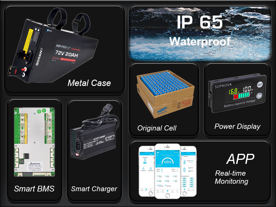 - 📱 Smart 72V Bluetooth BMS for Real-Time Monitoring & Control : Take intelligent command of your 72V 20AH battery with the built-in smart BMS. Featuring Bluetooth communication, it allows for real-time monitoring of voltage, temperature, and state of charge via a mobile app. This smart lithium battery enables remote control for enhanced security, convenience, and battery longevity.