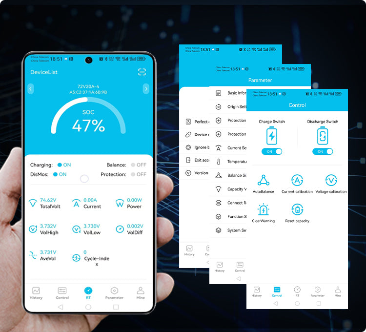 Bluetooth communication, active voltage balancing. Overcharge, over discharge, short circuit and overload protection.